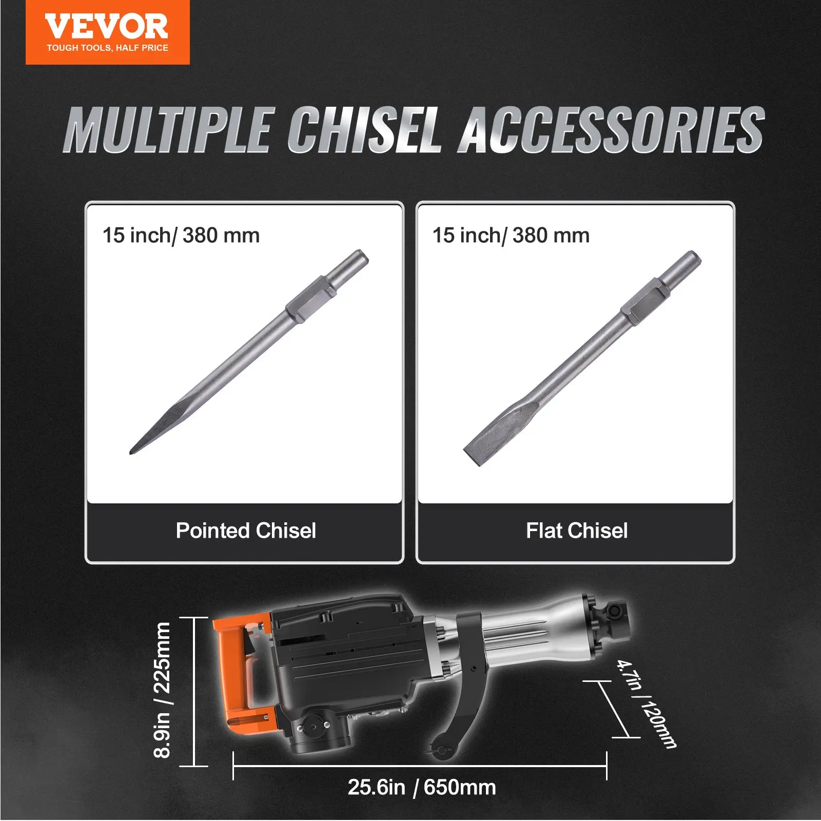 Power Type: Corded-electric,Chuck Size: 1-1/8″,Scraping Chisel: 16.1”/410 mm,Point Chisel: 14.9”/380 mm,Voltage: 110V,Item Model Number: JH-65A,Motor Power: 2200 Watts,Clay Spade Chisel: 17.3”/440 mm,Chuck Type: Hex,Flat Chisel: 14.9”/380 mm