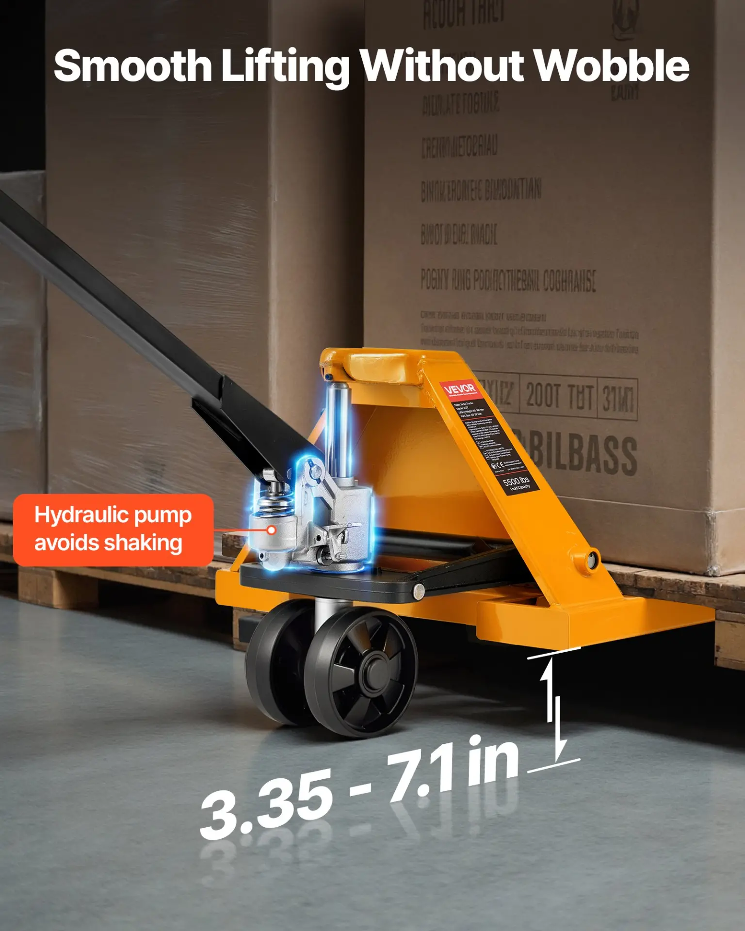 VEVOR Pallet Jack, 5500 lbs Load Capacity, Manual Pallet Truck with 48L x 27W Inch Forks for Material Handling, 3.35-7.1 Inch Fork Lift Height Range, Suitable for Warehouse, Supermarket, Manufacturing