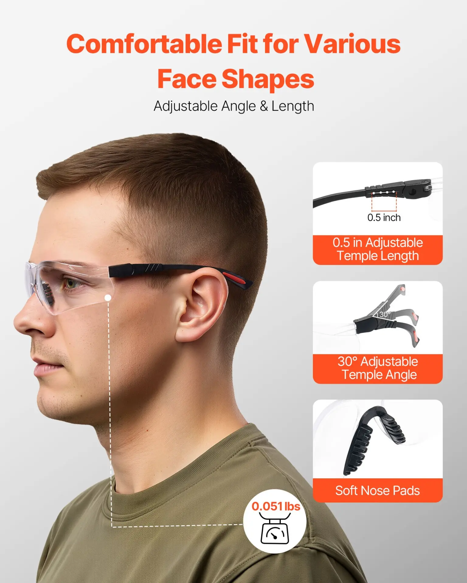 VEVOR Safety Glasses, Anti-Fog and Scratch-Resistant Clear Lens, Safety Goggles with Adjustable Length and Angle, ANSI Z87.1+ Impact-Resistant Protective Eye Goggles, for Work, Lab & Construction