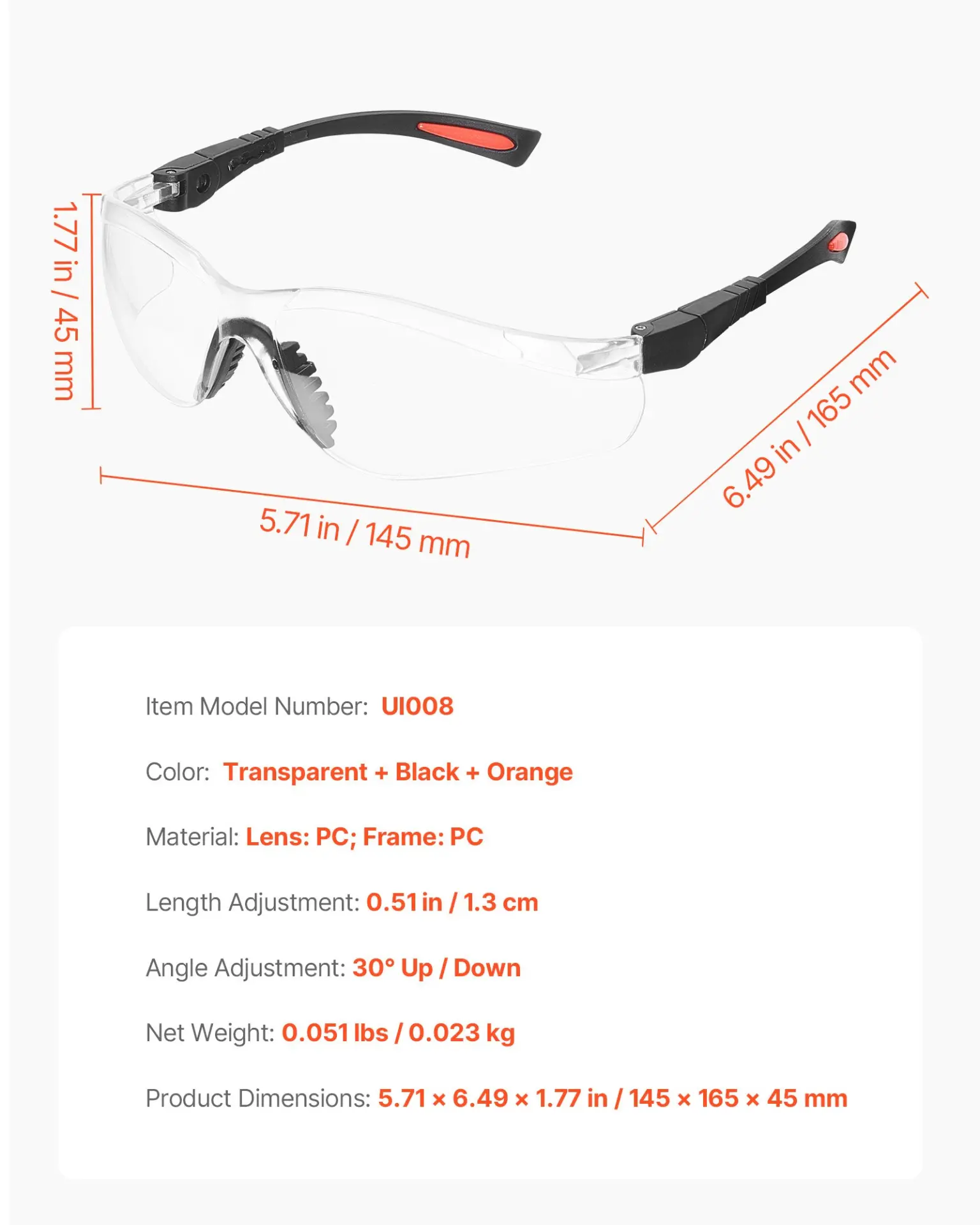 Angle Adjustment: 30 Up / Down,Color: Transparent + Black + Orange,Item Model Number: UI008,Material: Lens: PC; Frame: PC,Product Dimensions: 5.71 x 2.09 x 1.77 in / 145 x 53 x 45 mm,Net Weight: 0.051 lbs / 0.023 kg,Length Adjustment: 0.51 in / 1.3 cm,Lens Thickness: 0.071 in / 1.8 mm