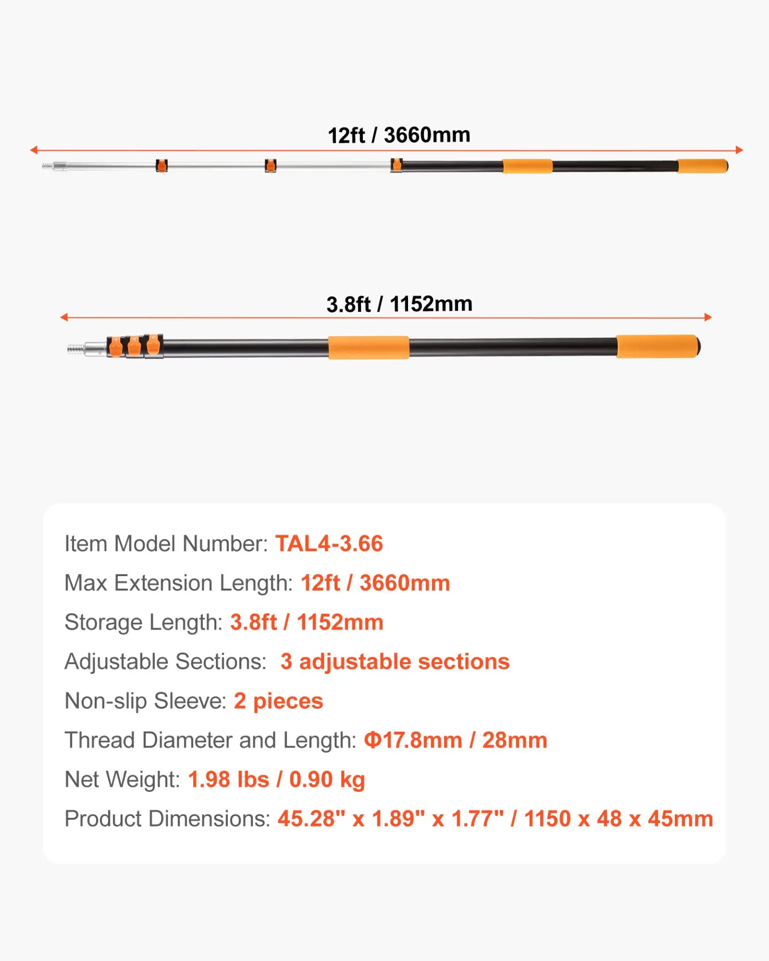 Adjustable Sections: 3 Adjustable Sections,Item Model Number: TAL4-3.66,Storage Length: 3.8 ft / 1152 mm,Item Dimensions: 45.28 x 1.89 x 1.77 inch / 1150 x 48 x 45 mm,Non-slip Sleeve: 2 Pieces,Thread Diameter and Length: 17.8 mm / 28 mm,Max Extension Length: 12 ft / 3660 mm,Net Weight: 1.98 lbs / 0.90 kg