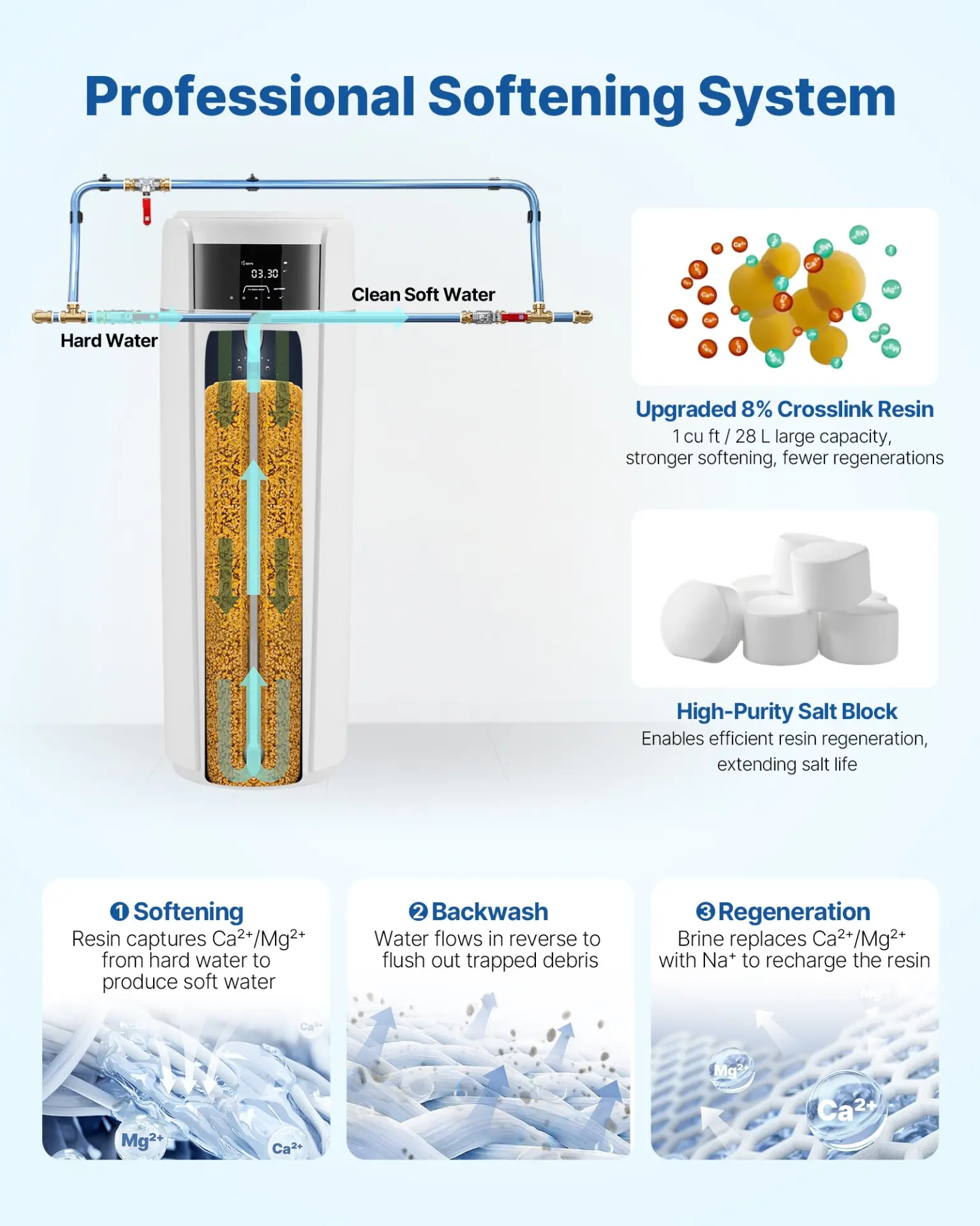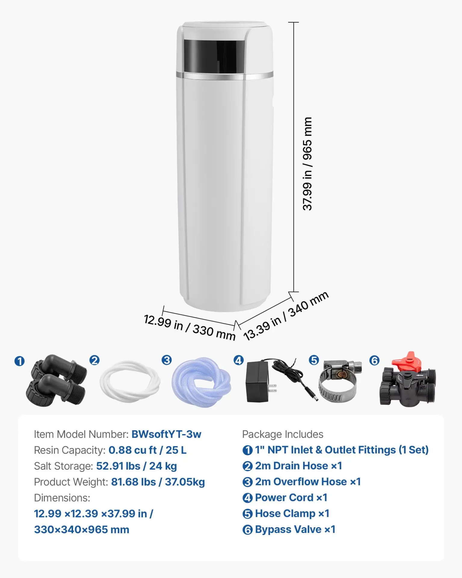 Resin Capacity: 0.88 cu ft / 25 L ,Item Model Number: BWsoftYT-3w ,Product Weight: 81.68 lbs / 37.05 kg ,Dimensions: 12.99 x 13.39 x 37.99 in / 330 x 340 x 965 mm,Salt Storage: 52.91 lbs / 24 kg